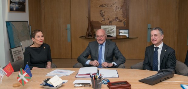 Uxue Barkos, Alain Rousset e Íñigo Urkullu durante una reunión de la Eurorregión Nueva Aquitania-Euskadi-Navarra realizada en marzo de 2017. Fuente: Orain