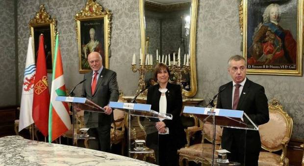 Uxue Barkos junto a Alain Rousset (Nueva Aquitania) e Iñigo Urkullu (CAV), en la última asamblea ordinaria de la Eurorregión. Fuente: Noticias de Navarra