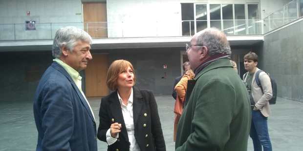Uxue Barkos y Koldo Martínez Urionabarrenetxea, conversando con Fernando Lizarbe (creador de Geroa Bai Argentina) en el Parlamento de Navarra